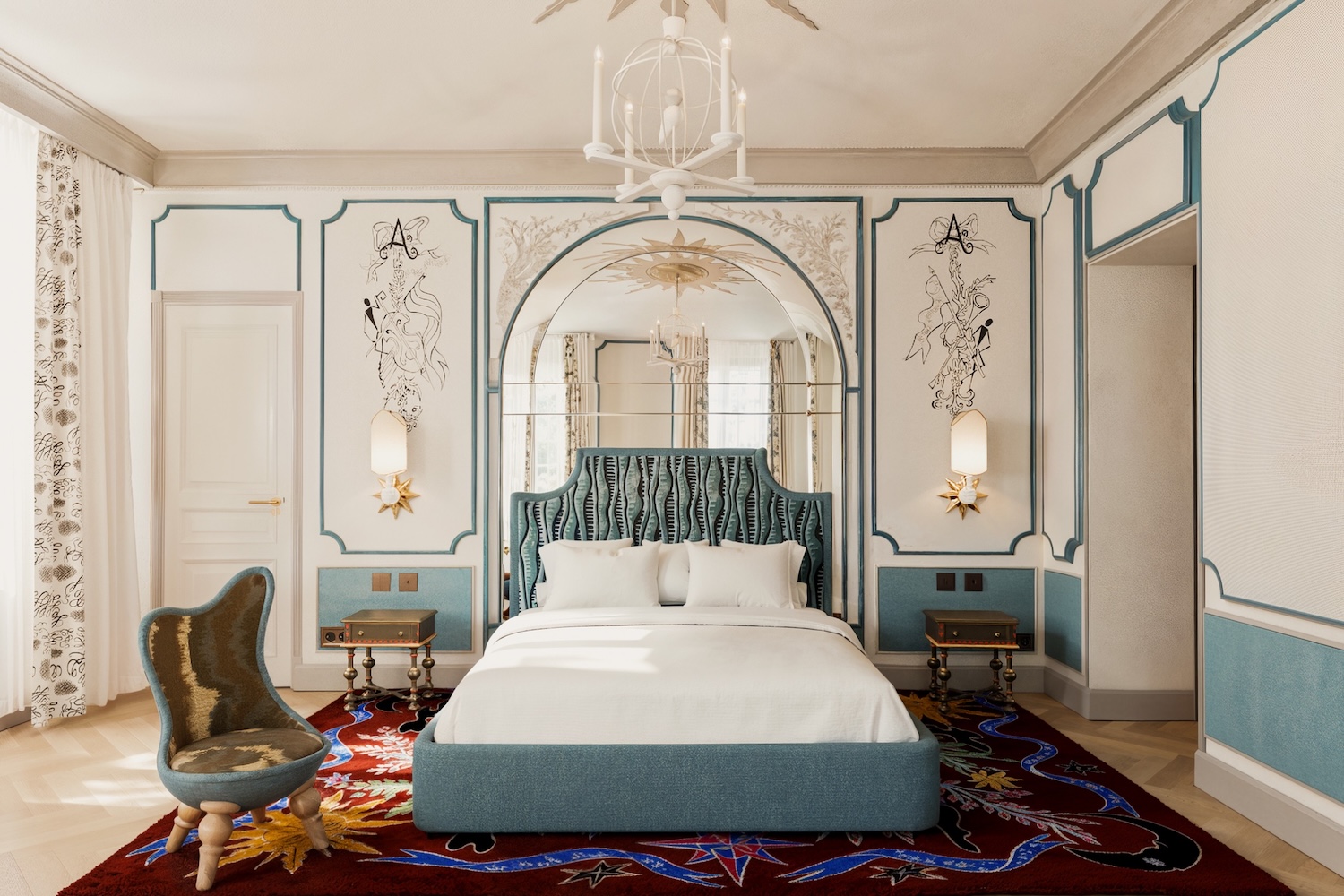 Les matières enveloppantes, les lumières tamisées et les détails graphiques créent une atmosphère chaleureuse, propice au repos après l’effervescence du club ou à un réveil paisible face à Paris.